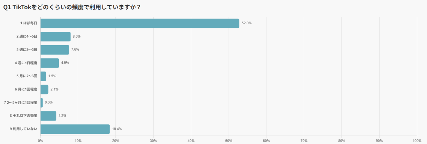 まずは、TikTokがどの程度日常的に使われているのかを全体で確認し、その後に年齢・性別ごとの違いを見ていきます。