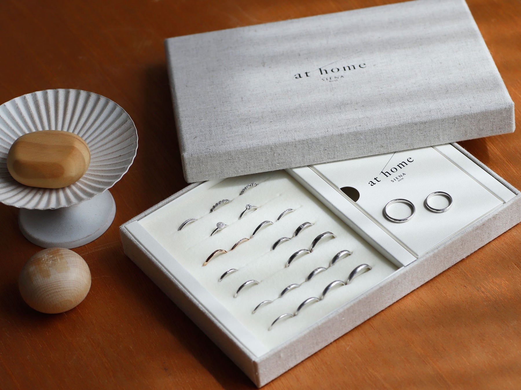 ご自宅でSIENAROSEの結婚・婚約指輪のサンプルリングをご覧いただきながら、オンライン購入もできるサービス。近くに店舗がない方、忙しくてなかなか来店が出来ない方、お二人の時間が合わない方など…様々な理由でご来店が難しい方に、お気軽にお試し頂きたいという思いから、サービスが始まりました。
