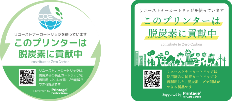 この活動の一環として、リユーストナーカートリッジをご利用の皆さまに「脱炭素ステッカー」の作成・配布を行っており、リユーストナーカートリッジの普及およびご利用者さまの脱炭素活動のアピールにつなげて参ります。
