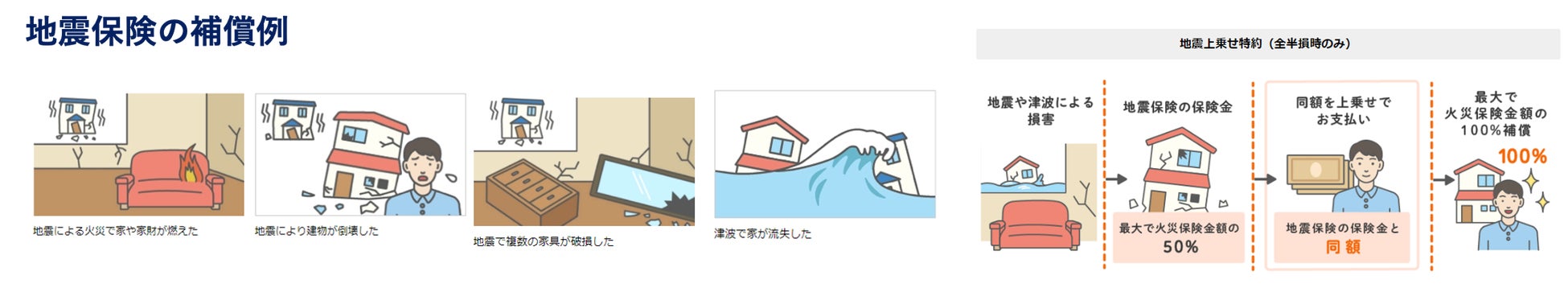 地震保険で補償される金額は、最大でも火災保険の保険金額の50%となっていますが、ソニー損保の新ネット火災保険では、「地震上乗せ特約(全半損時のみ)」(※1)をセットすることで最大100%(火災保険に対して)の補償額にすることが可能となっています。地震保険によって全損、大半損または小半損として保険金をお支払いする場合に、地震保険による保険金と同額をお支払いします。(一部損の場合はお支払いの対象外)なお、この特約は地震保険の保険金額を「火災保険の保険金額の50%」に設定した場合のみセットすることができます。