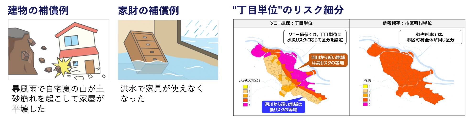 従来、水災の保険料は構造級別ごとに全国⼀律でしたが、ソニー損保では2024年10月1日以降に保険始期日となる契約を対象とした商品改定で、所在地を"丁⽬単位"で細分化してリスクを判定し保険料に反映します。"丁目単位"のリスク細分を導入することで、より実態に沿った合理的な保険料の実現を目指します。