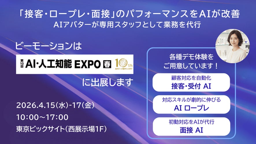 接客ソリューションサービス「接客オンデマンド」を提供するビーモーション株式会社(本社:東京都豊島区、代表取締役:伊藤 空、以下「ビーモーション」)は、2026年4月15日(水)から17日(金)まで東京ビッグサイトにて開催される「NexTech Week 2026【春】」(第10回 AI・人工知能 EXPO)に出展いたします。