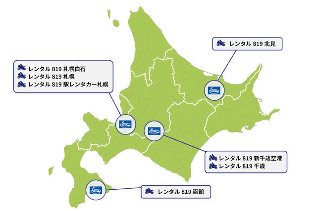レンタル819は北海道への空の玄関口、新千歳空港近辺に2店舗、JR札幌駅前に1店舗、札幌市内に2店舗、観光名所「五稜郭」からほど近い函館市内に1店舗、女満別空港からアクセスの良い北見市に1店舗、計7店舗を展開しています。