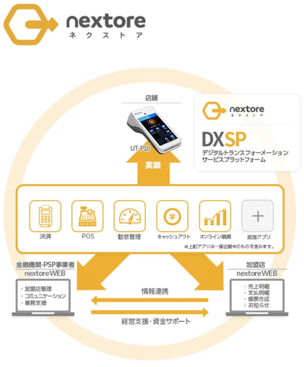金融機関やPSP事業者(Payment Service Provider)が「nextore」サービスを、小売店や飲食店、クリニックなどの中小規模事業者や、中小規模事業者向けサービス事業者へ提供し、決済などの情報を還流させることにより、コンサルティングや新たなサービスの提供など、デジタル化を支援することが可能です。