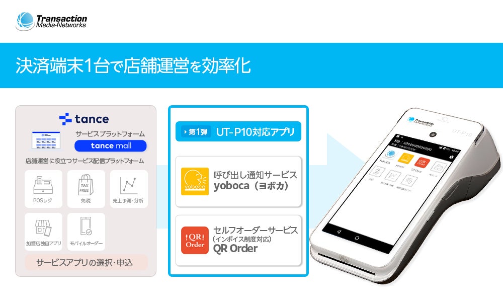 キャッシュレス決済サービスと情報プロセシング事業を推進する株式会社トランザクション・メディア・ネットワークス(本社:東京都中央区、代表取締役:大高 敦、グロース市場:5258、以下TMN)は、tance株式会社(本社:東京都新宿区、代表取締役社長:中井 和寛、以下tance)が運営する店舗向けサービスプラットフォーム「tance mall」で、TMNの決済端末「UT-P10」向けアプリへの対応が開始されたことを、お知らせいたします。
