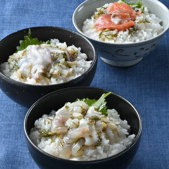 三陸産にこだわった、磯の香り漂う3種。スルメイカ・メカブ・ツブガイをベースに、銀ザケ、ヒラメ、タコをそれぞれ組み合わせ、甘みのある白醤油を使ったタレで見事にまとめている。ご飯はもちろん、辛口の酒も進みそうだ。
