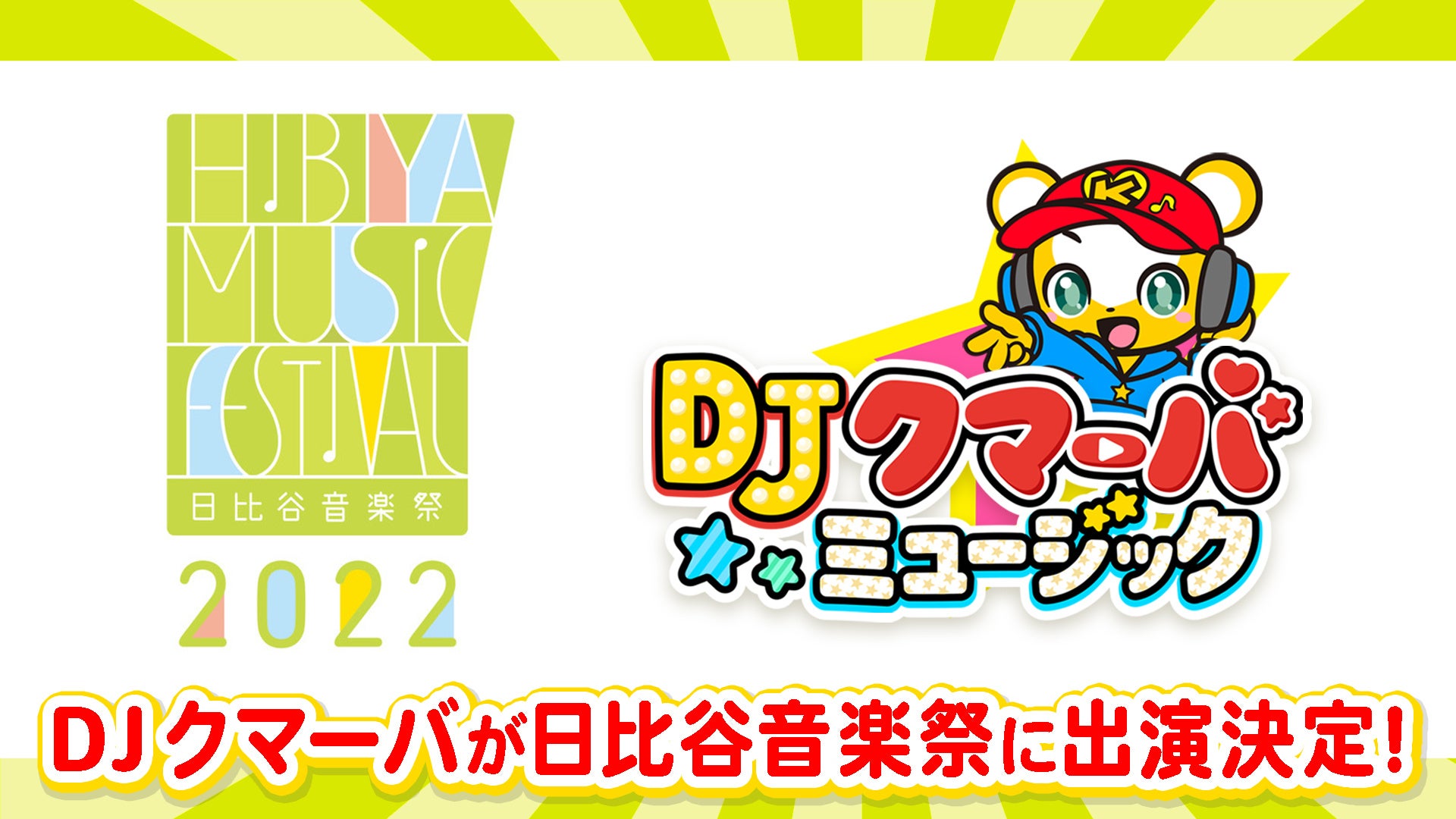 株式会社Kumarba(本社:東京都品川区、代表取締役社長:樋渡昇一郎、以下「Kumarba」)と、ユニバーサル ミュージック合同会社(本社:東京都渋谷区、 社長兼最高経営責任者(CEO):藤倉尚、 以下、「ユニバーサル ミュージック」)のキッズソングプロジェクト「DJクマーバミュージック」のDJクマーバが、2022年6月4日と5日に東京・日比谷公園エリアにて開催される音楽イベント「日比谷音楽祭2022」への出演が決定しました。