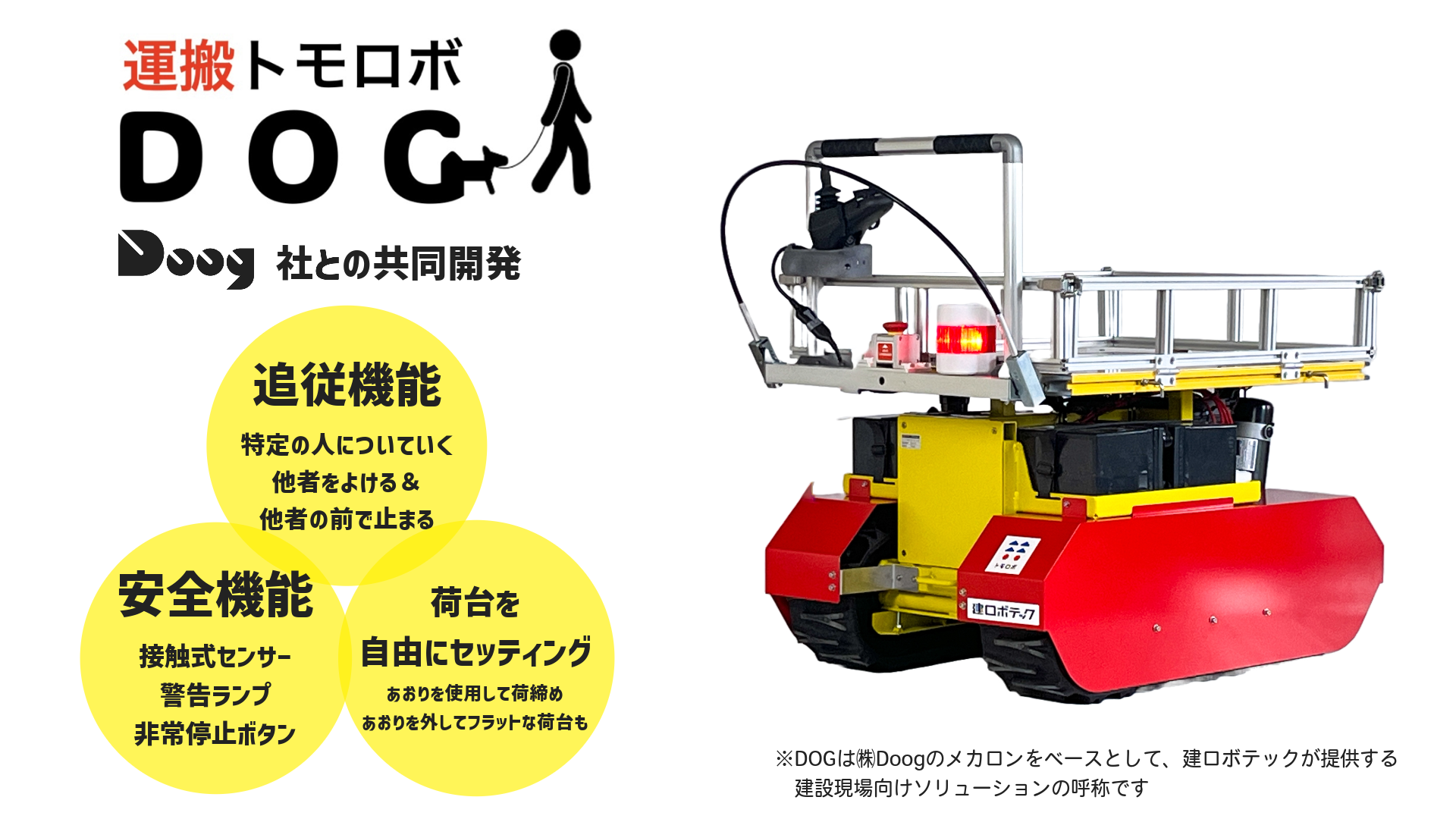 これまでDoogが開発してきたロボット機能と機動力に優れた協働運搬ロボット「サウザー」や、農業向けに開発したクローラーロボット「メカロン」の建設現場向けにカスタマイズ・ソリューション開発を行っており、この度第1弾として建設現場専用クローラーロボット「DOG」を発表します。さらに、専用新製品の共同開発を進めており、近日発表予定です。