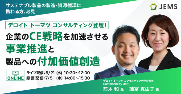 「ITで環境問題に挑む」をコーポレートスローガンに掲げる株式会社JEMS(本社:茨城県つくば市、代表取締役:須永裕毅)は、サーキュラーエコノミー政策やエコデザイン規則に関心のあるサステナビリティ部門や事業部門の方に向けて、無料のオンラインセミナーを開催します。