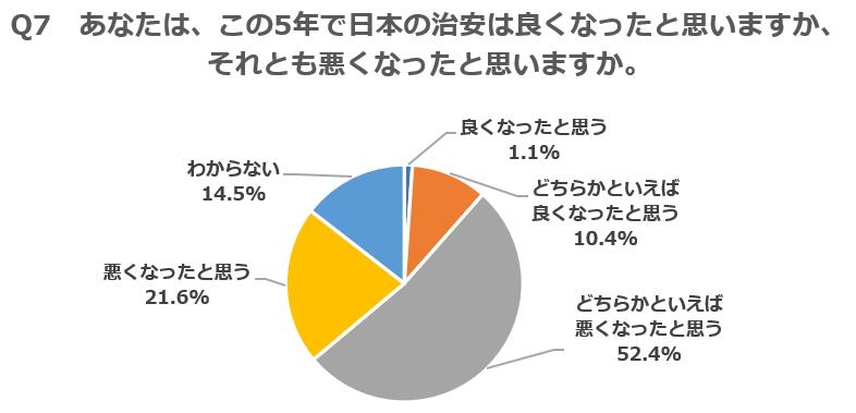 - この5年で日本の治安が悪くなったと思う人は「どちらかといえば」を含め74.0%だった。(Q7)