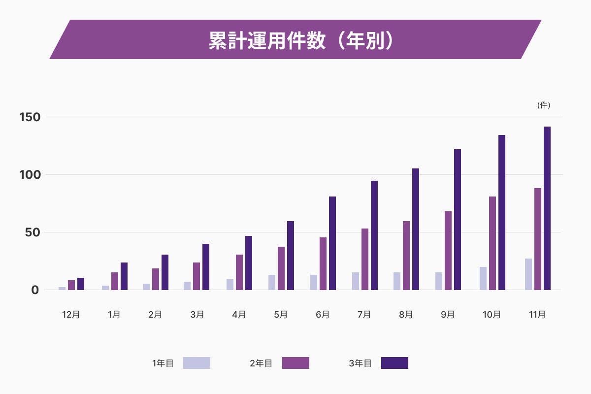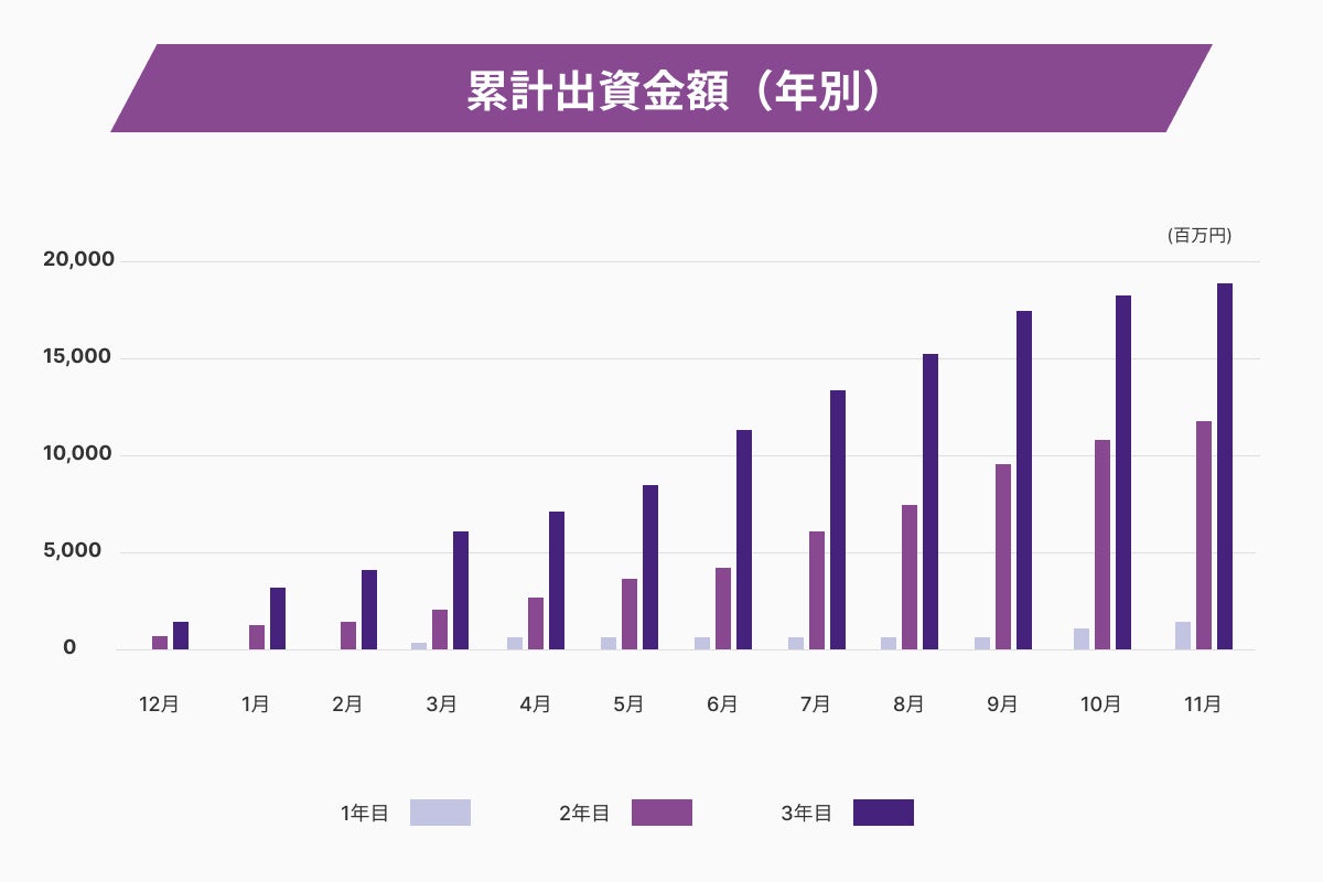開業1年目は月平均の募集額は約85百万円/月、募集件数も2件弱/月程度に留まっていたものの、1周年を機に徐々に募集金額・件数とも増えはじめ、2年目では月平均の募集額約10億円弱/月、募集件数は約6件強/月となりました。3年目は、2年目を上回る月平均募集額約16億円弱/月、募集件数約12件強/月となり、順調に成長を続けています。