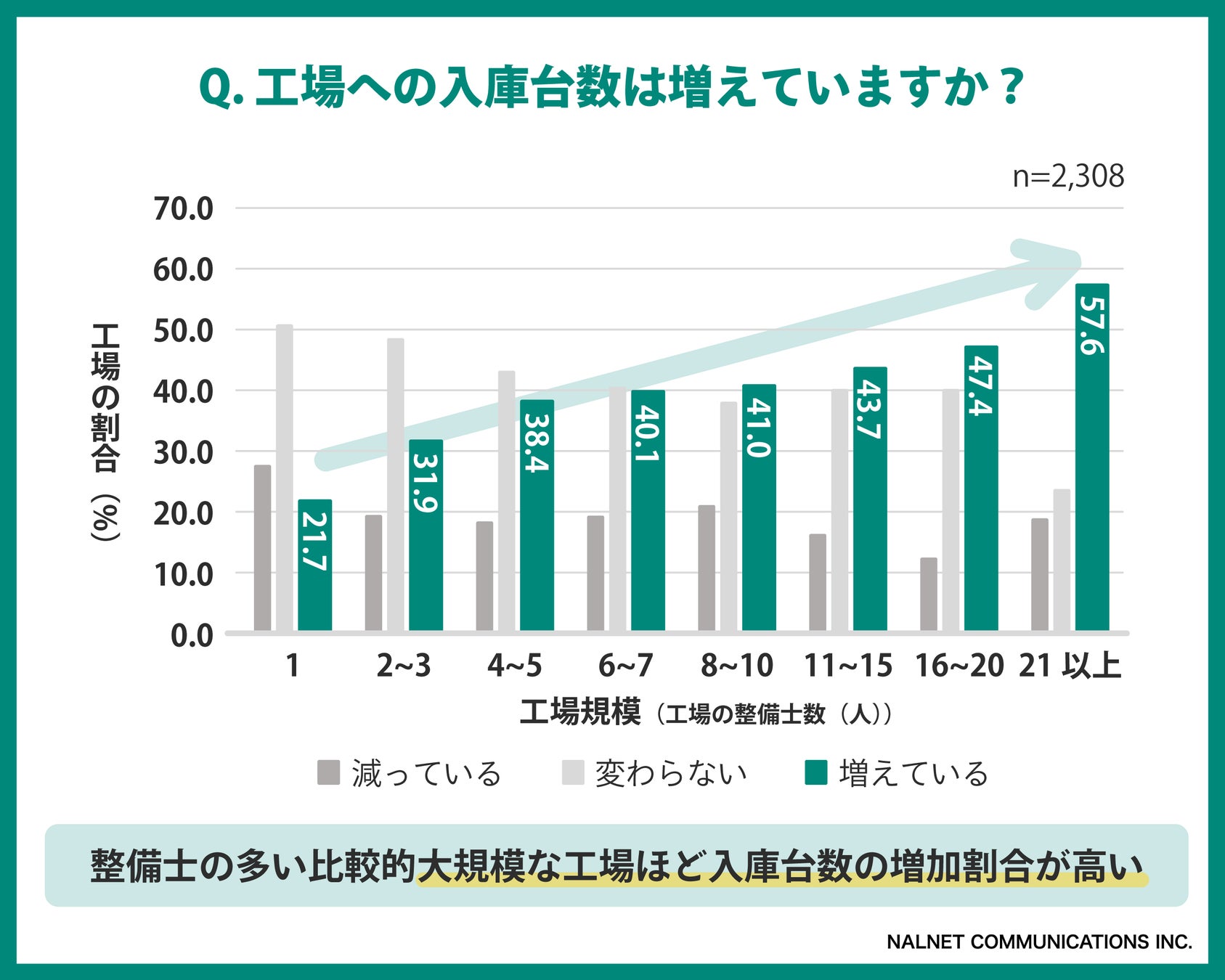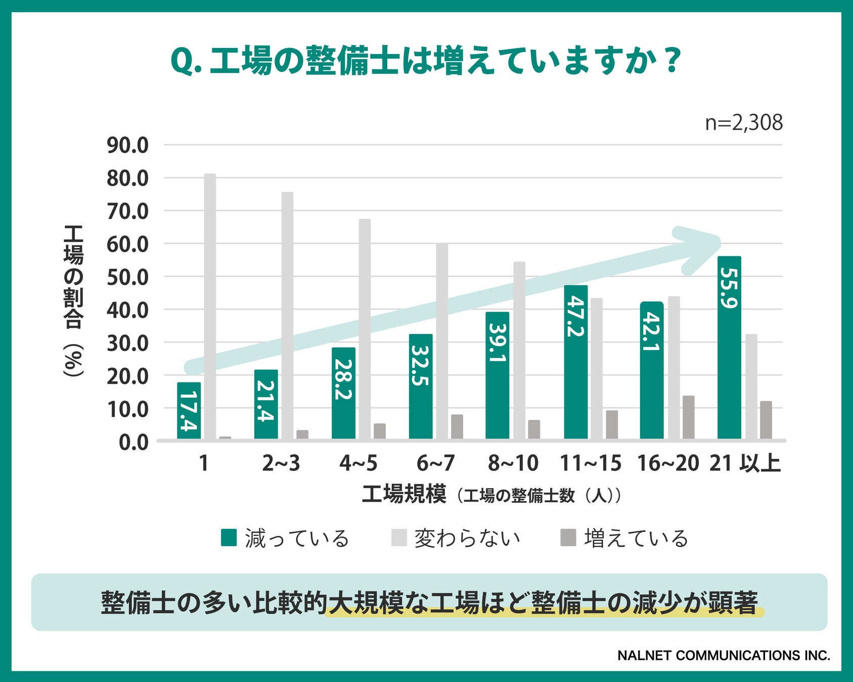 今回のアンケートでは、「整備士が減っている工場」と「入庫台数が増加している工場」が、どちらも規模の大きい工場に集中しており、大規模工場の整備現場がひっ迫している状況が想像できます。