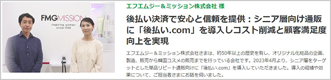 保証付き「後払い.com」導入事例 エフエムジー&ミッション株式会社、シニア層向け通販に「後払い.com」を導入しコスト削減と顧客満足度向上を実現