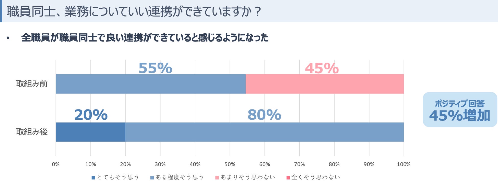 今回の取り組みでは、小さな成功体験の積み重ねと職員との対話が成果につながったポイントでした。取組み前に職員に対して、キックオフ宣言を行ったことで、チームとして前向きな取り組む姿勢が芽生えています。職員個々の積極性が高まり、半年経った今でも職員同士のコミュニケーションの機会は明らかに増えていると感じています。