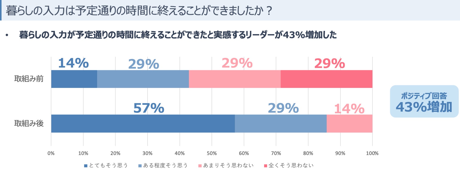 そこで生まれた余力を現場の業務サポートに充てることで、チーム全体の余力創出につなげ、今後の生産性向上に向けた取組みの土台を整えた。 -