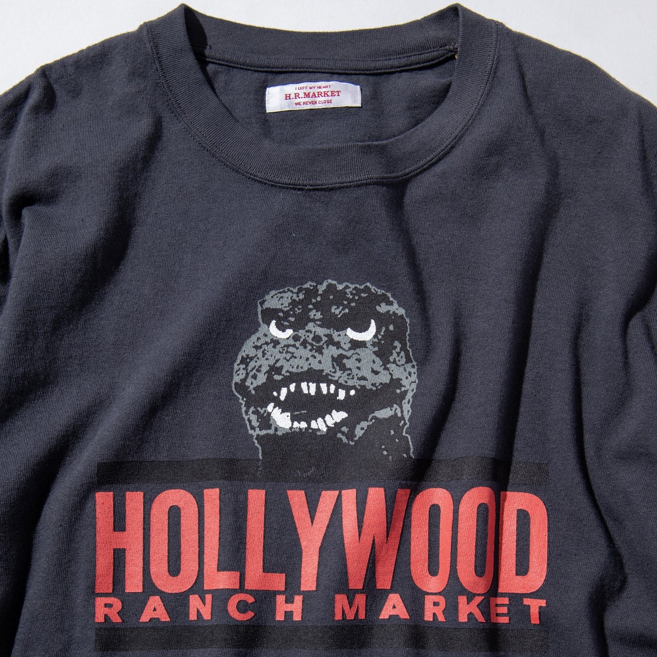 レトロなタッチで、どこか愛嬌のあるゴジラの顔と「ハリウッド ランチ マーケット」のロゴを大きくプリントしたオリジナルデザイン。映画のポスターを思わせる印象的なグラフィックが特徴です。