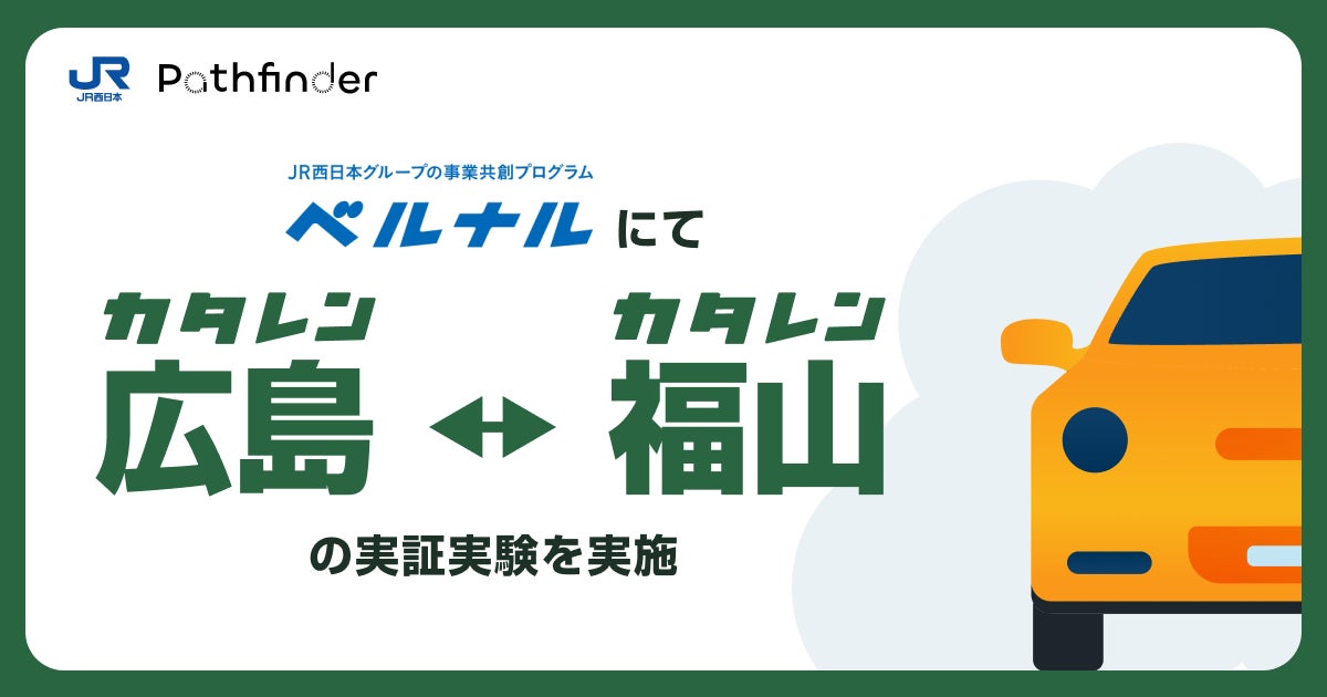 MaaS社会の実現に不可欠な最適配置アルゴリズムを開発・運用するスタートアップPathfinder株式会社(東京都港区 代表取締役:小野崎悠介 以下、当社)は、西日本旅客鉄道株式会社(本社:大阪市北区、代表取締役社長:長谷川 一明)、株式会社JR西日本イノベーショ ンズ(本社:大阪市北区、代表取締役社長:川本 亮)が展開する、JR西日本グループが持つ特徴ある資産等を活用し、スタートアップ企業等と新しい価値を創出する事業共創プログラム「ベルナル」にて片道レンタカー「カタレン」の実証実験を2025年1月27日(月)~2月16日(日)まで広島-福山間で実施いたします。