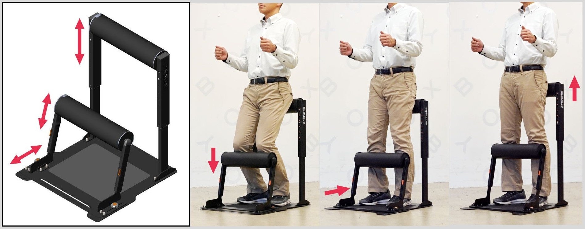 スタビツインは、スネ用・モモ用それぞれのクッションについて、高さと前後位置を個別に調整できます。使用者の身長や体型、立ち姿勢(まっすぐ/軽い前傾など)に応じて、最適なポジションに設定可能です。