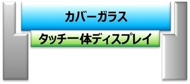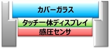 一方、一般的なスマートフォンの構造は、カバーガラスとディスプレイ(+タッチパネル)が一体の構造になっています。次世代方式の「らくらくタッチパネル」は、この一般的なディスプレイ構造の背面に「Picoleaf」を搭載し、この一体化させたDisplayユニット自体をセンサーとして、指の微細な押し圧を検知し、「らくらくタッチパネル」の機能を実現しています。