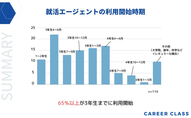 就活エージェントの開始時期について、6割以上が「1〜3年生で利用し始めた」という結果になりました。
