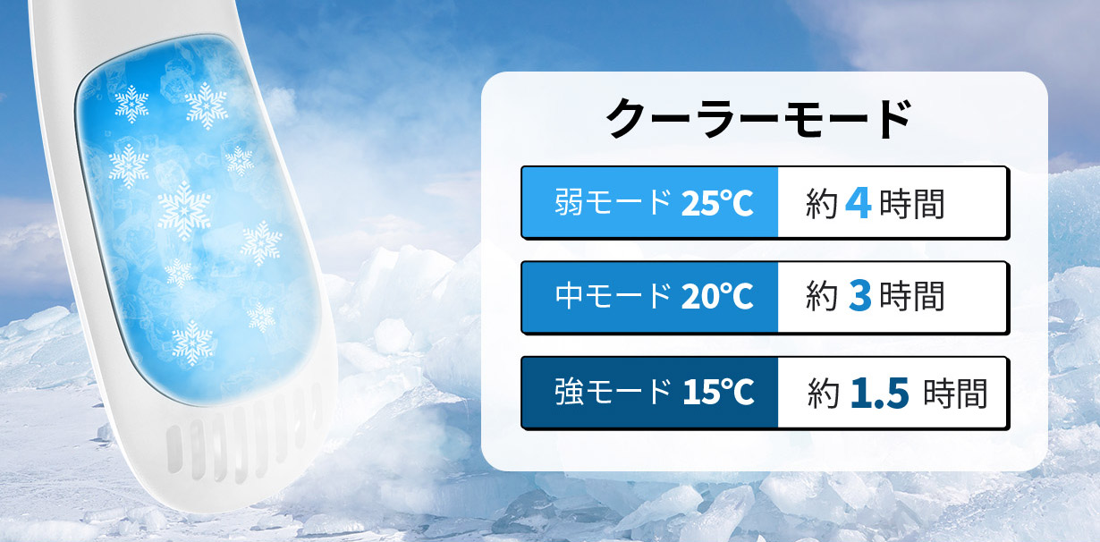 またはクーラーモードとヒートモードはそれぞれ3段階の温度調節が可能で、暑い季節のみならず、寒い季節にもお使いいただけます。