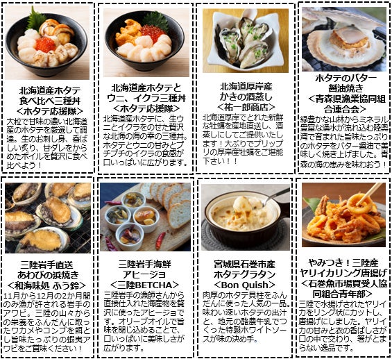 「発見!ふくしまお魚まつり」と連携し、北海道・東北地方の厳選した魚介料理を集めた「食べて応援!ニッポンの幸」エリアを設けます。一部の国や地域による日本の水産物の輸入規制の影響を受けたホタテなど、日本の海の幸のおいしさを発信し、日本の漁業・水産業を応援することを目的としています。
