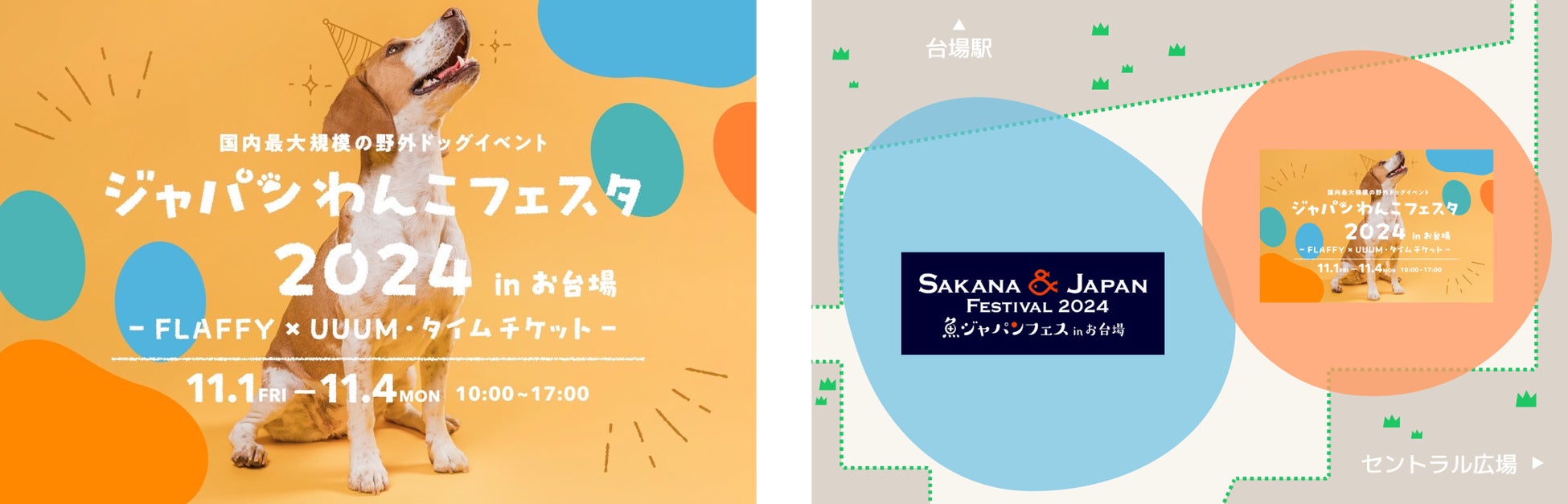 ワンちゃんと飼い主さんが一緒に楽しめるイベント「ジャパンわんこフェスタ2024 in お台場ー FLAFFY × UUUM・タイムチケットー」が11月1~4日に、隣接する特設会場で同時開催されます。ドッグフードや洋服など約60ブースが並ぶ「わんこマルシェ」やワンちゃんが映えるフォトスポット、 飲食エリアのほか、ワンちゃん好きの著名人やクリエイターによるステージプログラムなど、ワンちゃんと一緒に楽しめるコンテンツが盛りだくさん!愛犬と一緒に魚介グルメや買い物を楽しめる、今までにない魚介グルメフェスとドックイベントの融合を、ぜひ会場でお楽しみください。