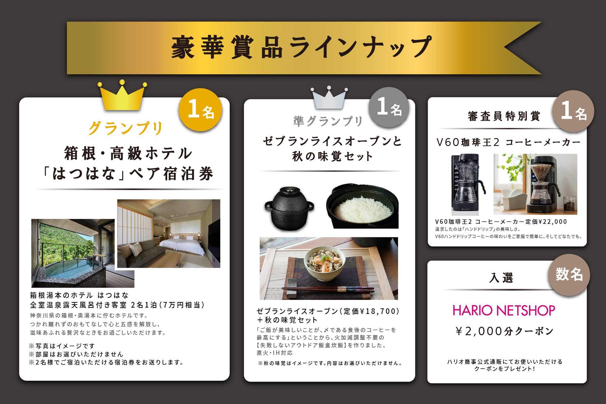 好評につき、2022年に続く2年目の開催となる「Zebrangフォトコンテスト」。受賞作品は、アウトドアコーヒーを楽しむZebrangのイメージフォトとしてZebrang公式サイトや各種メディアに掲載予定です。また、受賞された方には「箱根・高級ホテル はつはな ペア宿泊券」をはじめ、豪華賞品をご用意しております。