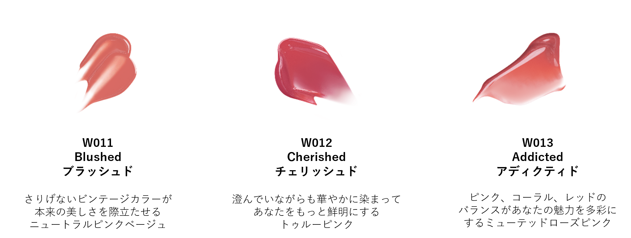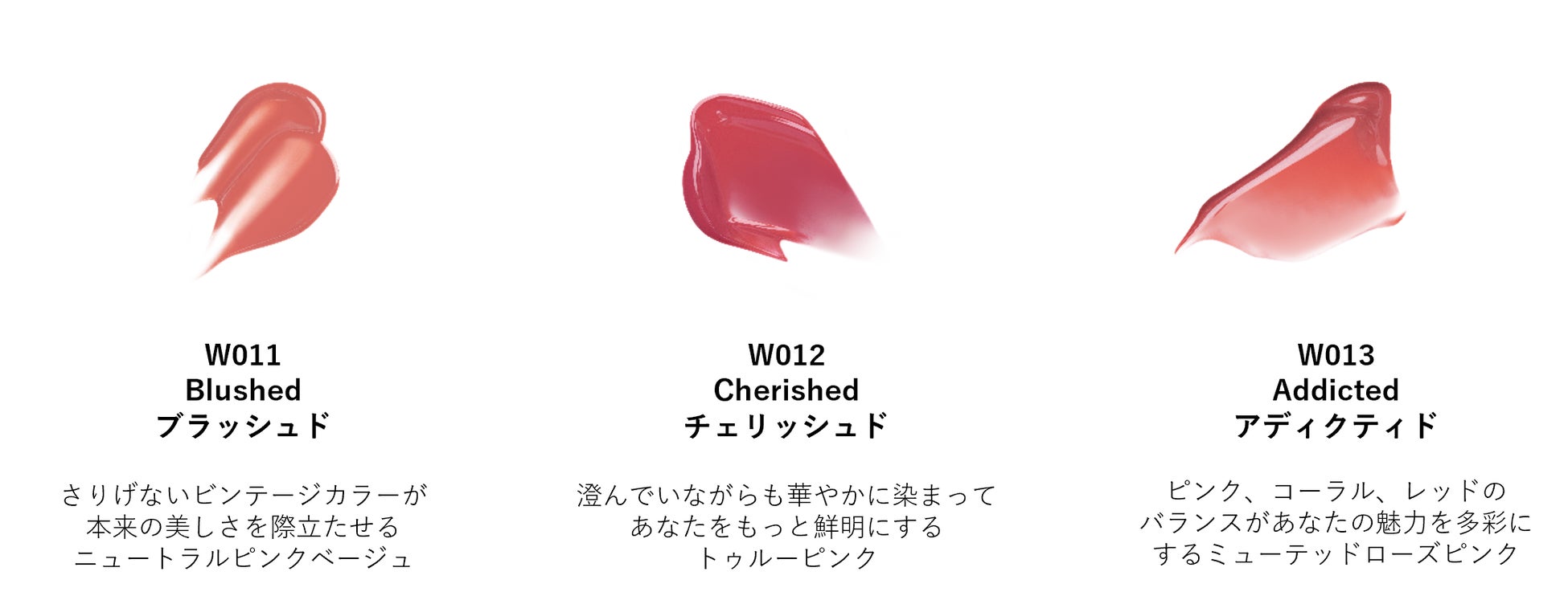 従来品と同様、透明感のある潤いに満ちたテクスチャーで乾燥せずしっとりとした唇に。