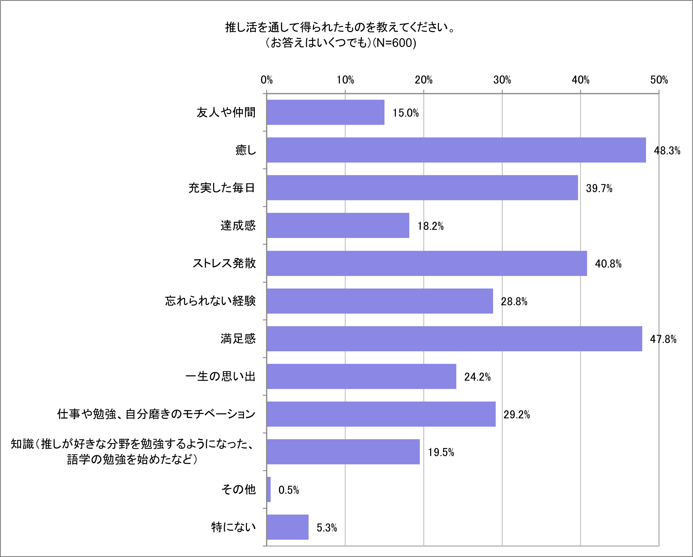 ● 約95.0%が推し活を通して得られたものがあると回答。具体的には1位「癒し(48.3%)」2位「満足感(47.8%)」3位「ストレス発散(40.8%)」
