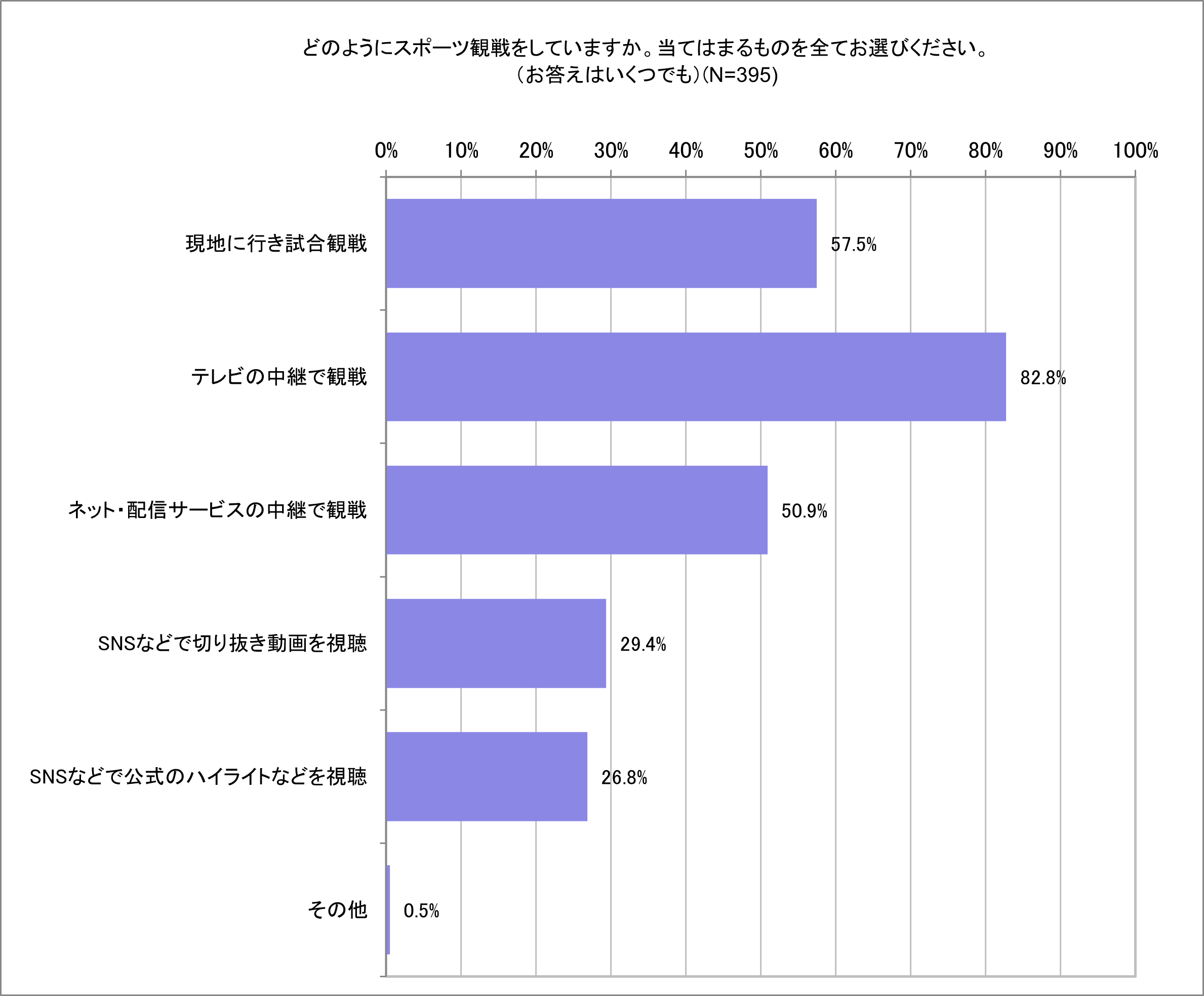 ● スポーツを観戦する方法で一番多いのは「テレビの中継(82.8%)」、次いで「現地に行き観戦する(57.5%)」「ネット・配信サービスの中継(50.9%)」と続く。
