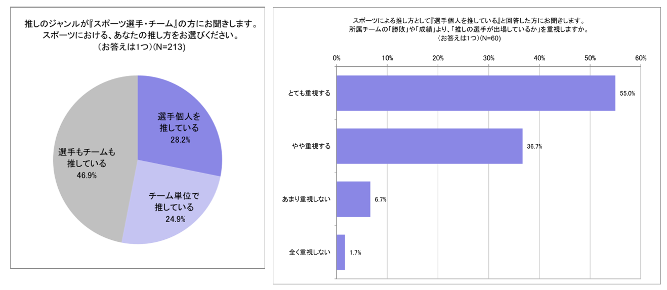 一方「選手個人」を推している方の91.7%がチームの勝敗より「推しの選手が出場しているか」を重視していることが判明し、推し活としての熱量が伺えます。