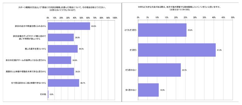 ● 現地で試合観戦をする理由は「試合の迫力や熱量を感じられるから」が63.0%で最も多く、3人に2人(66.6%)がW杯などの大会がある際は海外や地方でも現地観戦したいと回答