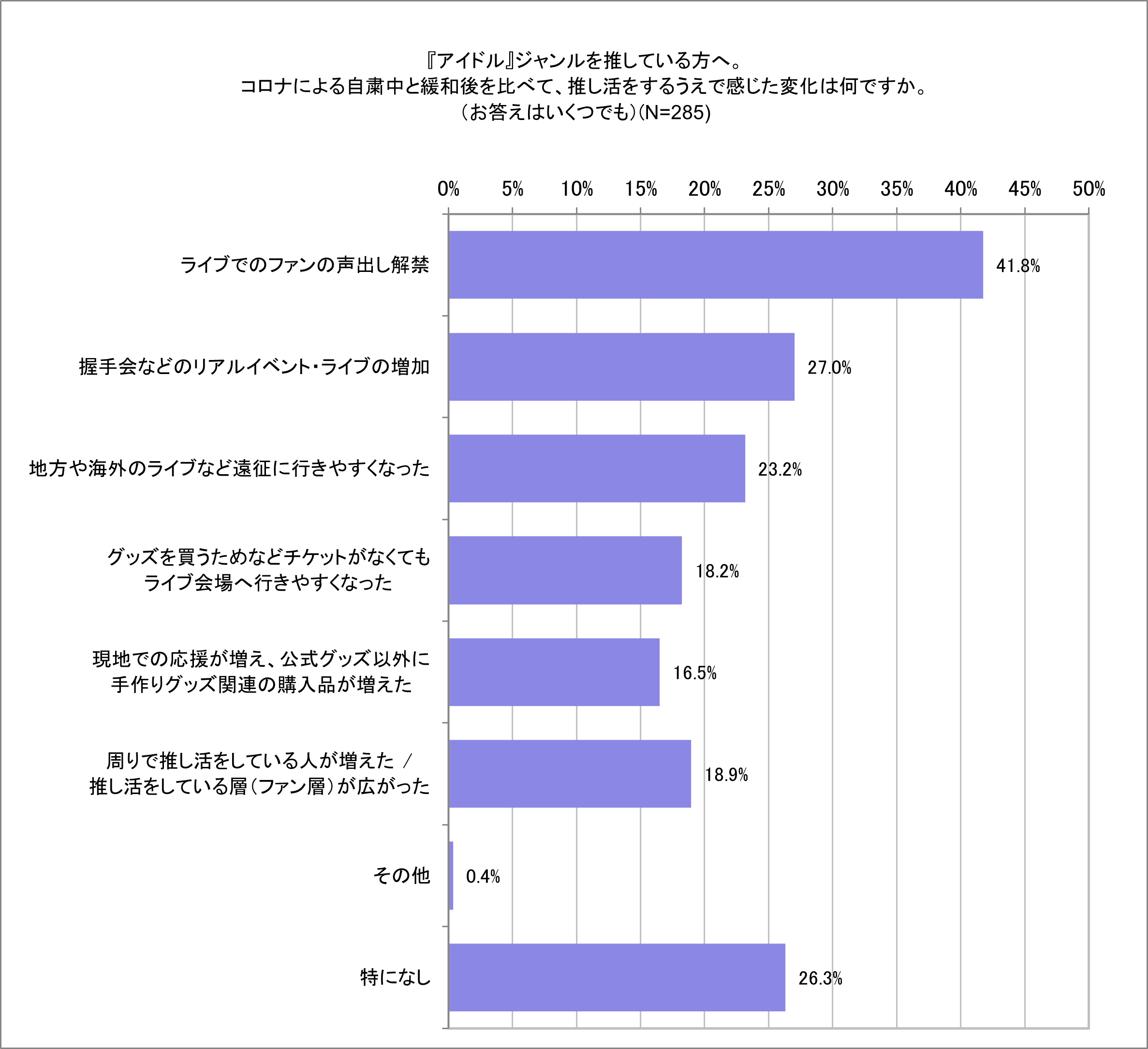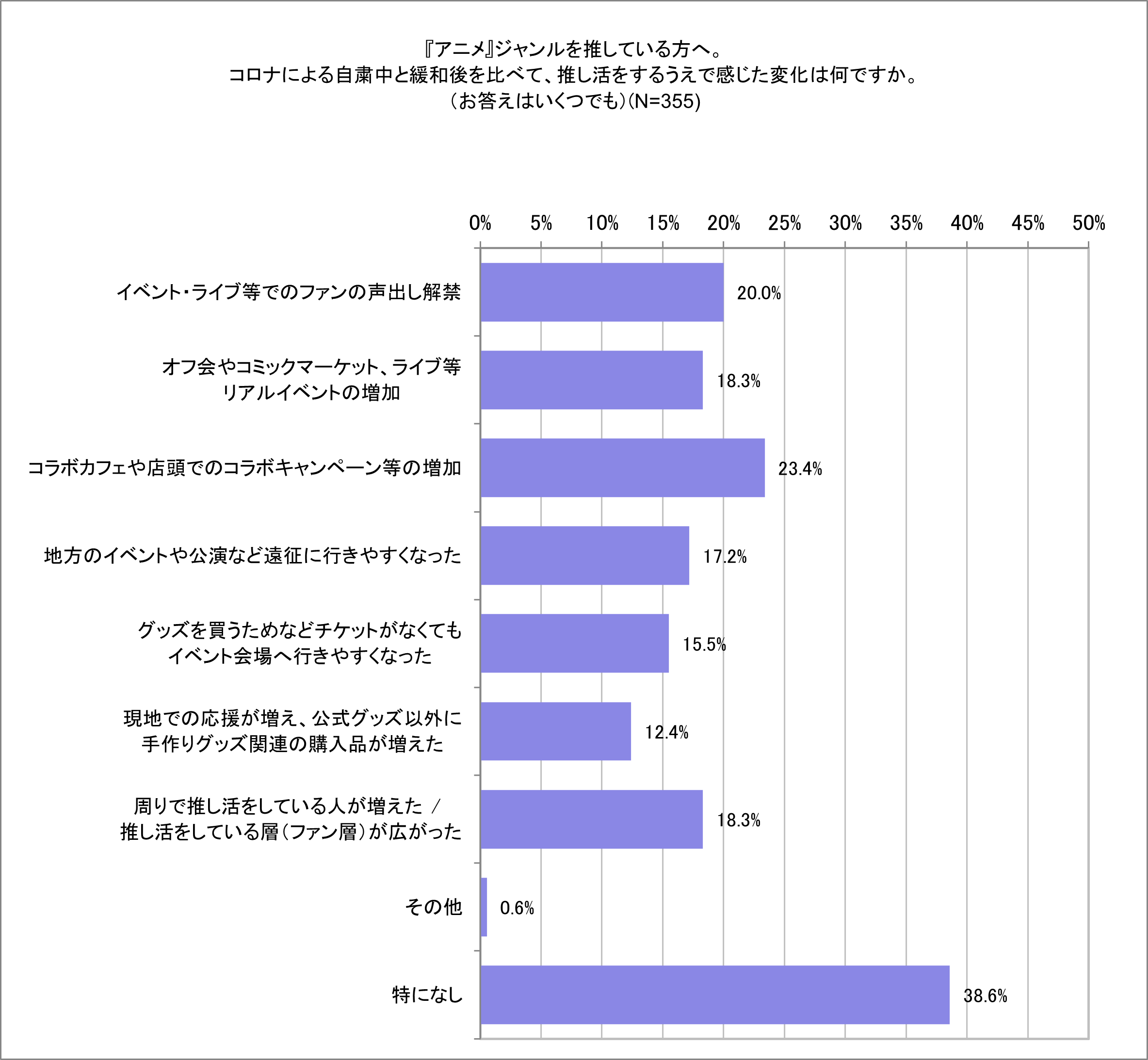 アイドル・アニメ・スポーツジャンル※1で比較した際、上記の結果となりました。またコロナ禍踏まえ待ち望んでいたことも共通してアイドル・スポーツジャンルでは「ファンの声出し解禁(アイドル32.6%、スポーツ40.4%)」、アニメジャンルでは「コラボカフェや店頭でのコラボキャンペーンの増加(23.4%)」が1位に。