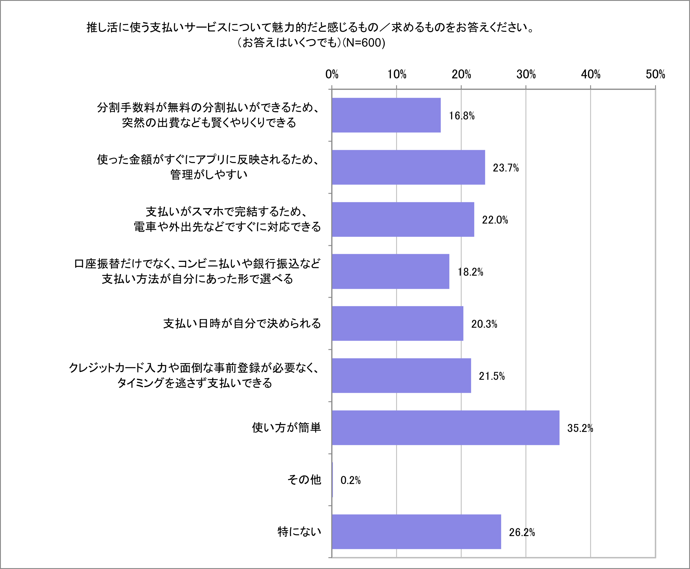 ● 推し活に望む支払いサービスとしては「使い方が簡単(35.2%)」という声に続き「使った金額がすぐにアプリに反映されて、管理がしやすいもの(23.7%)」「支払いがスマホで完結するため、電車や外出先などですぐに対応できるもの(22.0%)」という回答も多い。