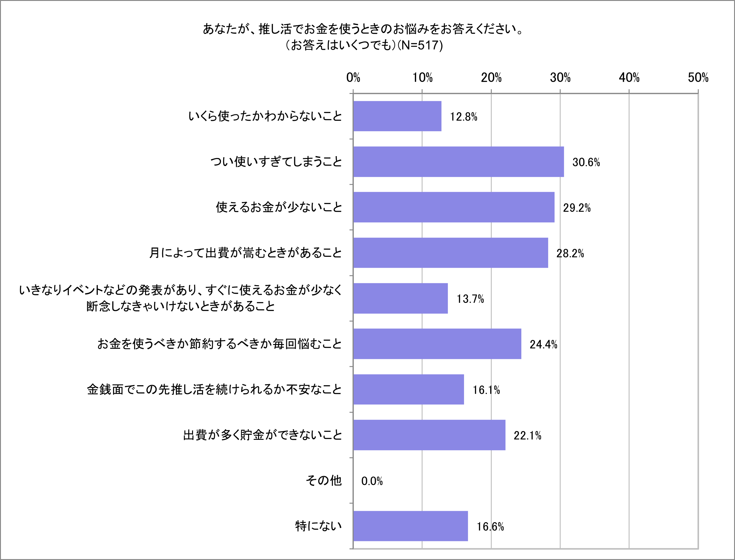 ● 推し活におけるお金の悩みは「つい使いすぎてしまうこと(30.6%)」「使えるお金が少ないこと(29.2%)」「月によって出費がかさむときがあること(28.2%)」が多い結果に。