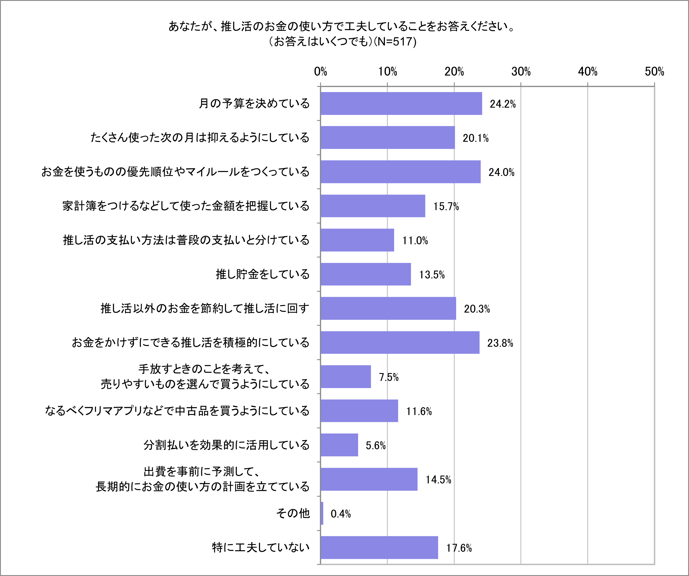 具体的には「月の予算を決めている(24.2%)」「お金を使うものの優先順位やマイルールをつくっている(24.0%)」などがあがりました。昨年※2(22.1%)1位「沢山使った月の翌月は調整」は今年は5位(20.1%)となり変動が見られました。全体を通して昨年よりも主体的に推し活をしている生活者の姿が見受けられます。