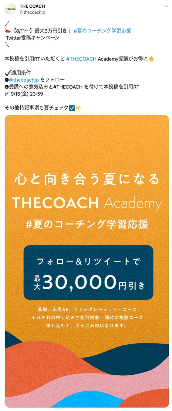期間内に、THE COACH Twitterアカウント(https://twitter.com/thecoachjp )をフォローし、指定の投稿をリツイートいただくと、THE COACH Academy受講料最大3万円(税別)がお得になります。