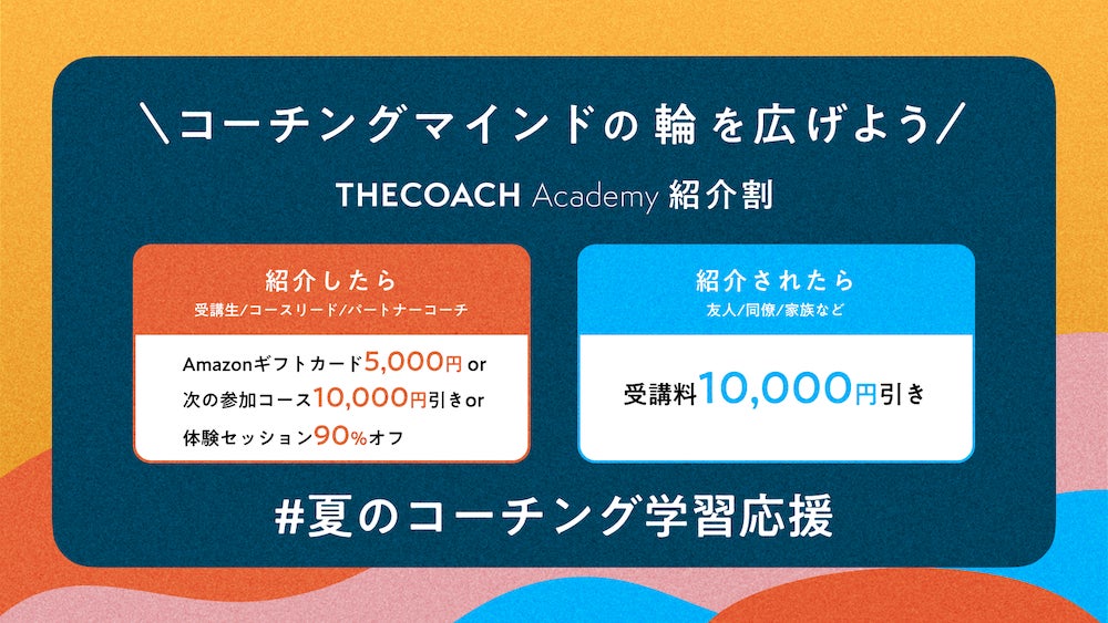 THE COACH Academyでは、コーチングマインドを広げることを目指し、お友達紹介特典を用意しています。受講生がご家族やご友人を紹介することで、双方に特典を提供するプログラムです。