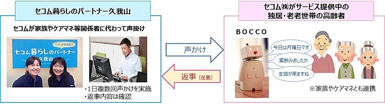 「セコム暮らしのパートナー久我山」のスタッフがコミュニケーションロボット「BOCCO」(※4)を通じて“定期的な挨拶”や“状況にあわせた声がけ”を行う実証実験中のサービス。実証実験のご参加者からはご好評をいただくとともに高齢者が抱える孤独や服薬といった社会課題の解決にも一定の効果が確認されており、高齢者のQOL維持・向上のための有効なサービスとして開発を進めています。