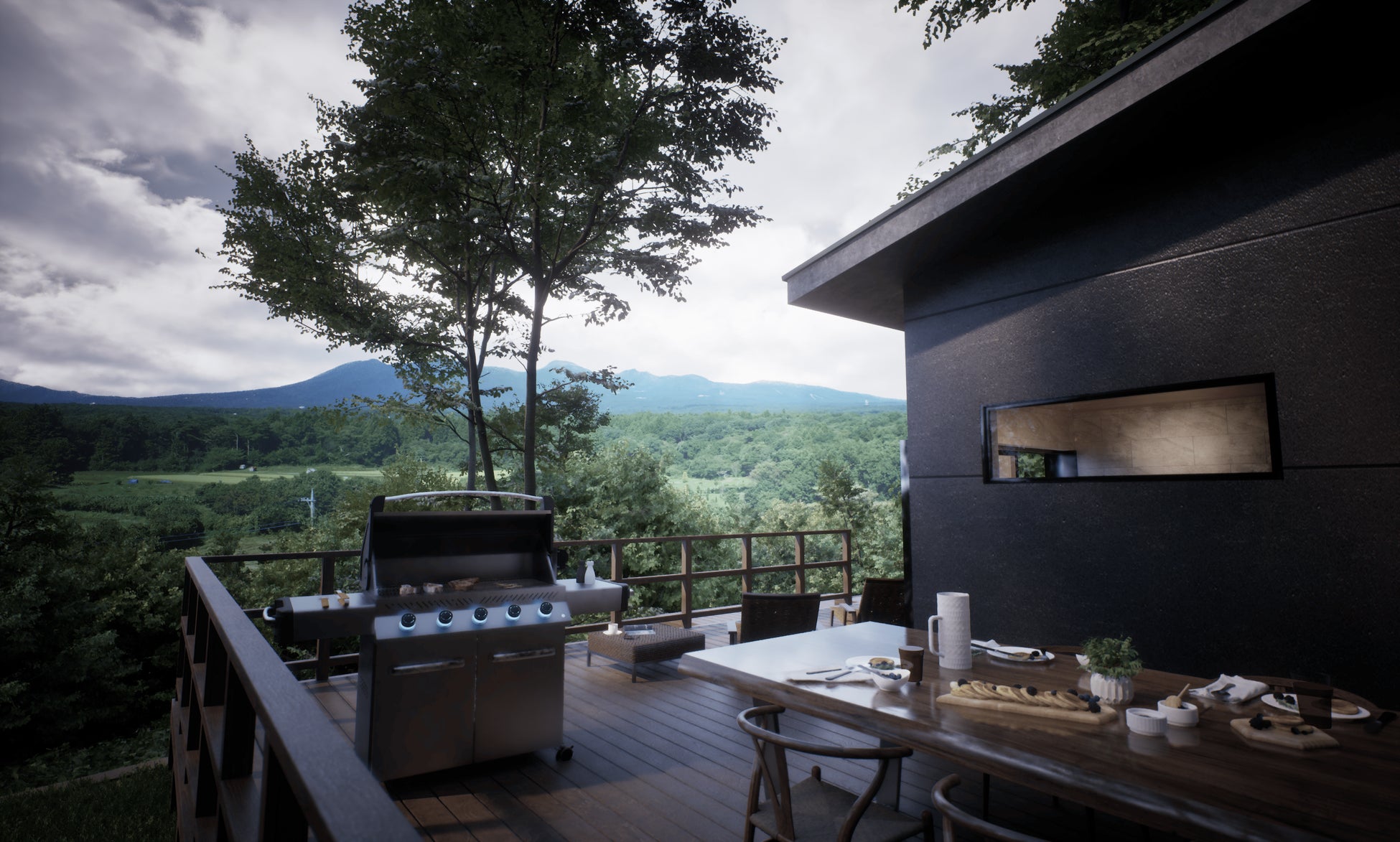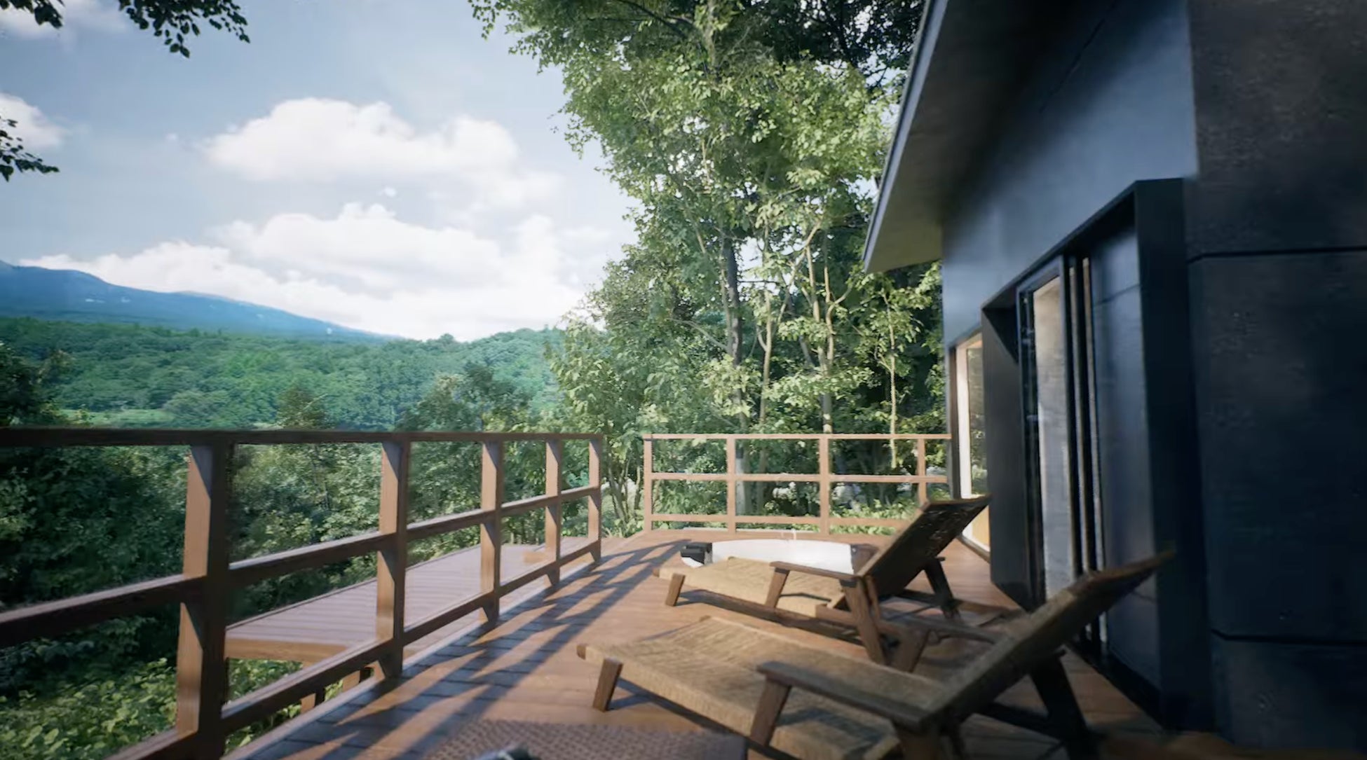 広々としたウッドデッキでは栃木県北部に連なる那須連山の絶景を見渡せます。
