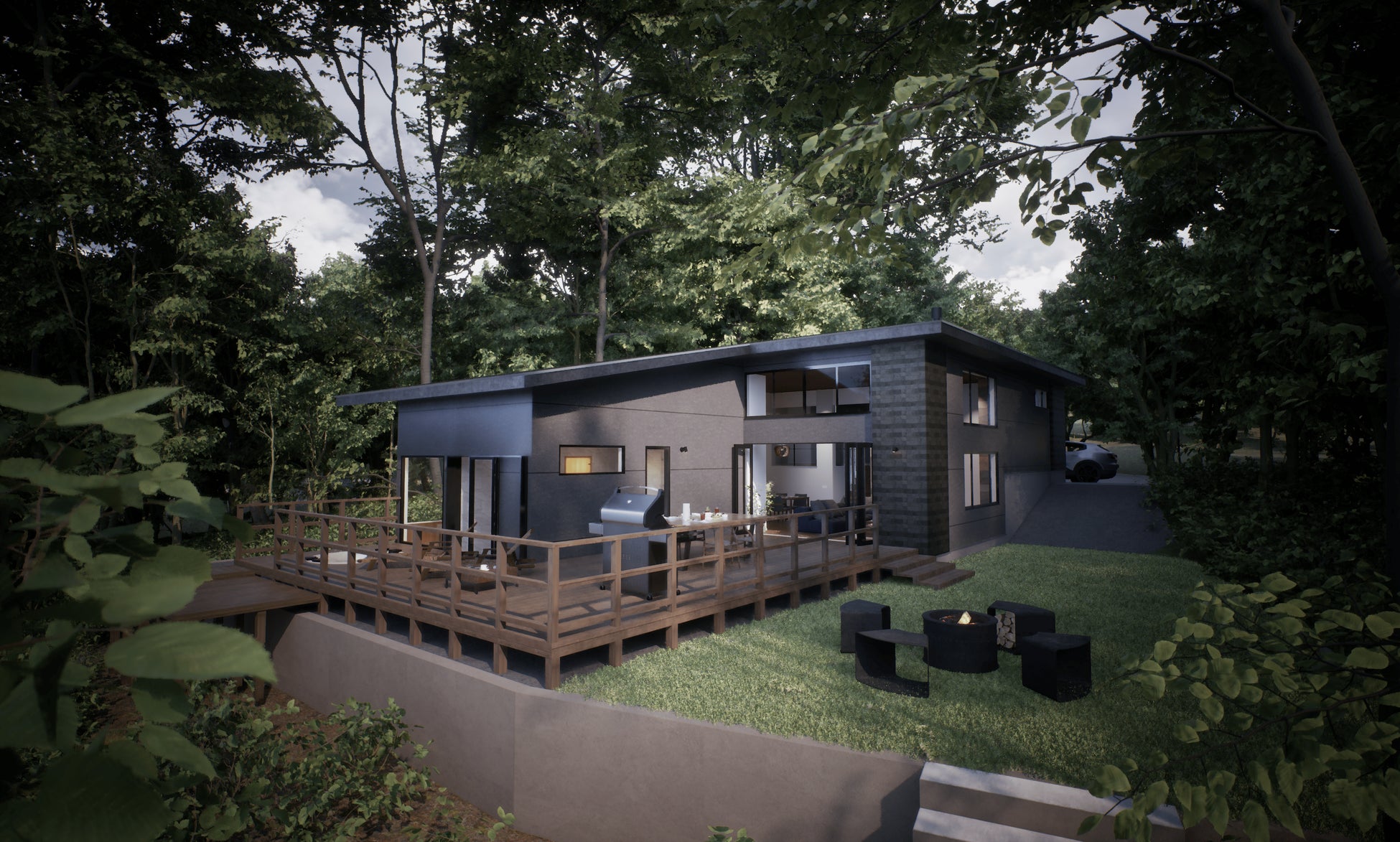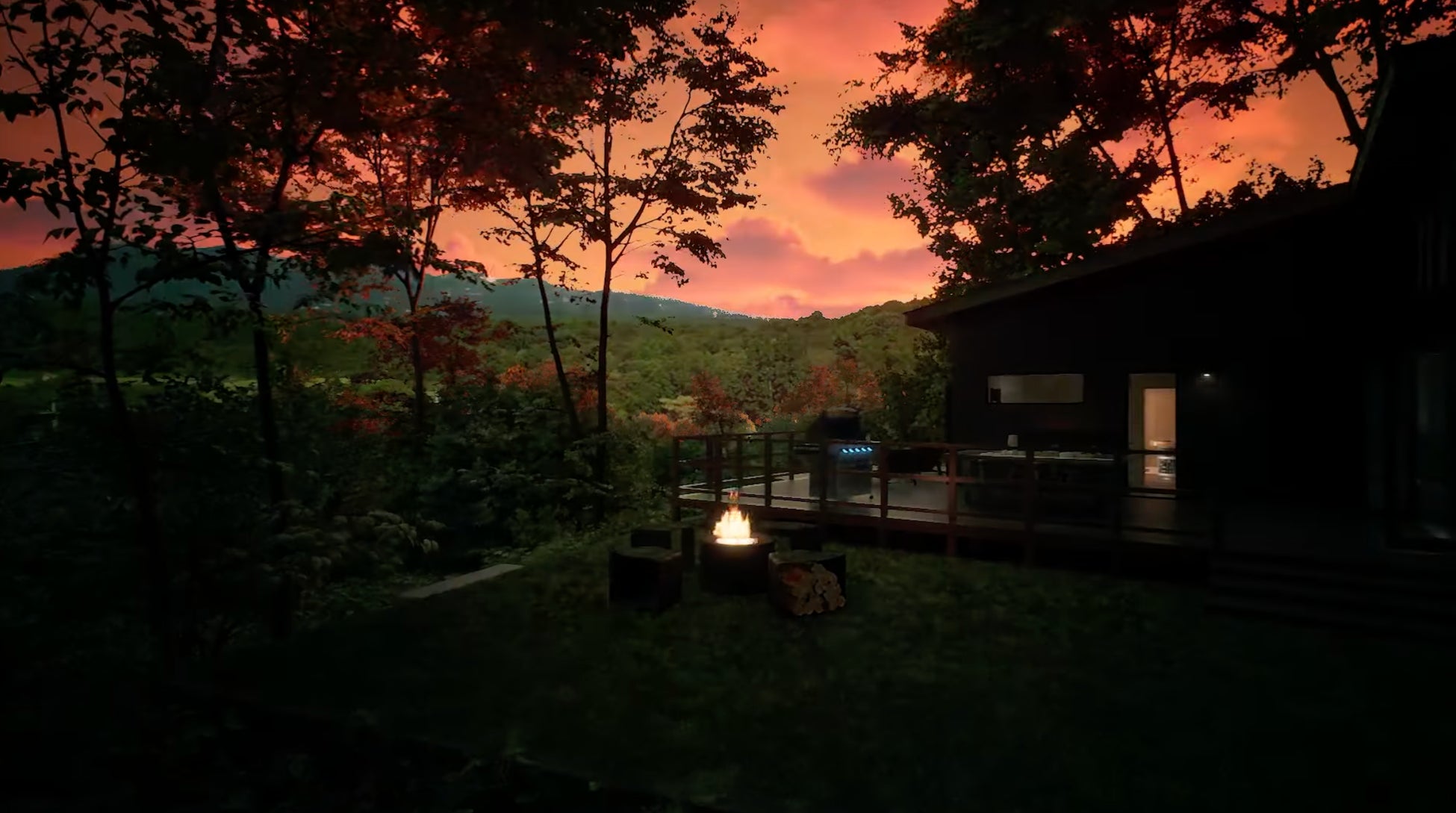 ガラス張りのプライベートサウナ、ファイヤーピット、薪ストーブ、BBQセットなど、多彩な設備を完備しています。