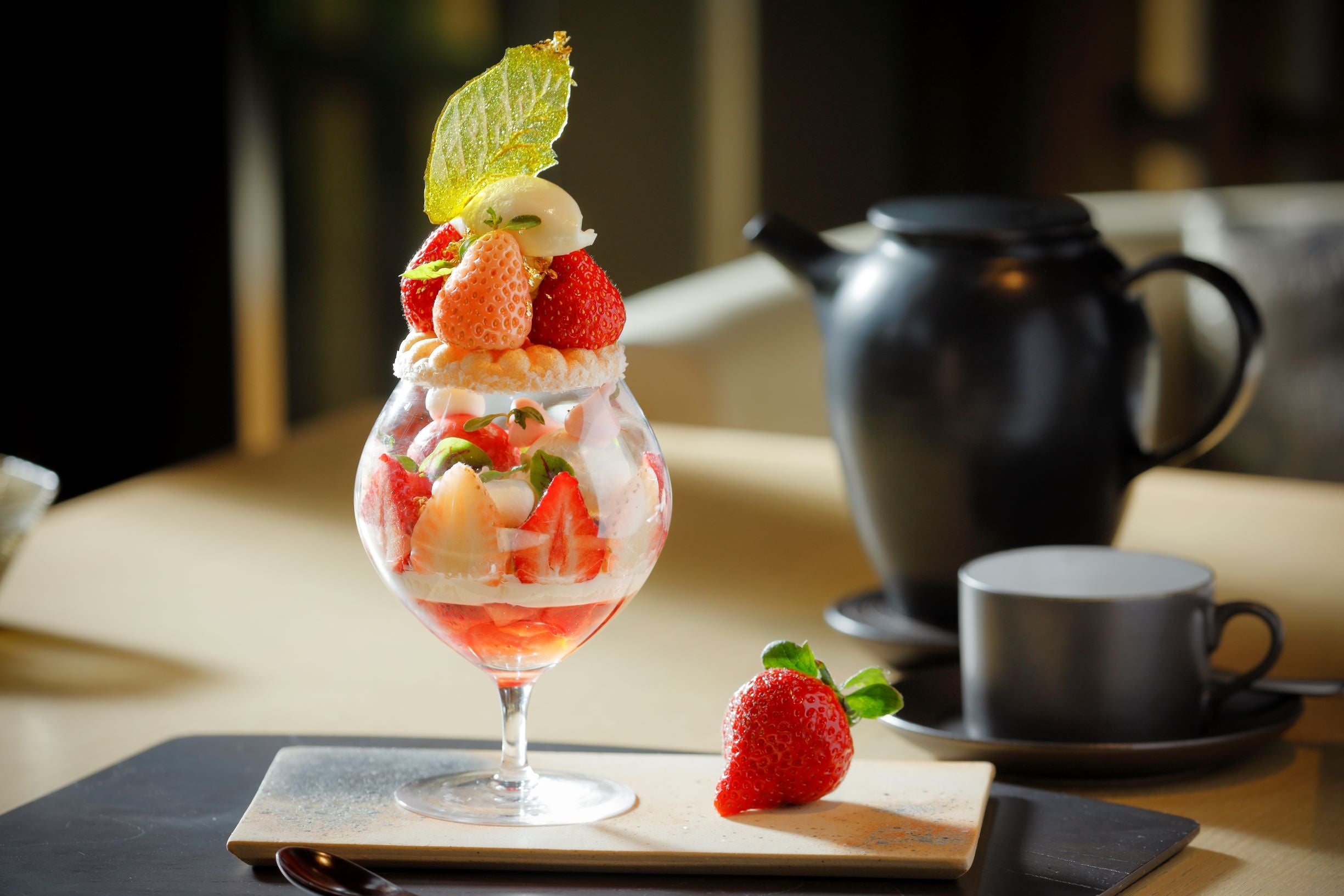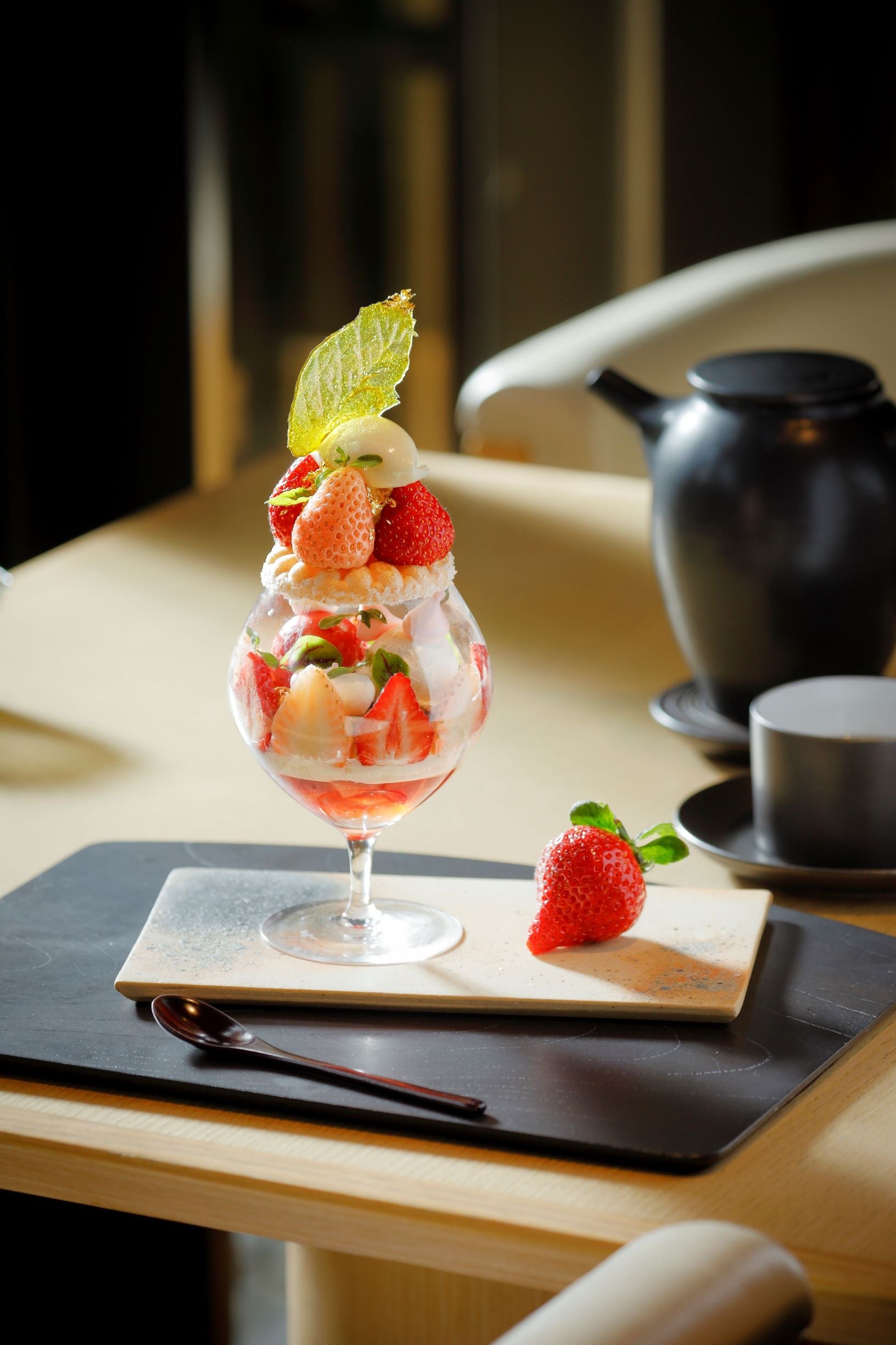 アマン京都の森の庭で来る春に想いを馳せながら、アートのように美しい苺パフェをお楽しみください。