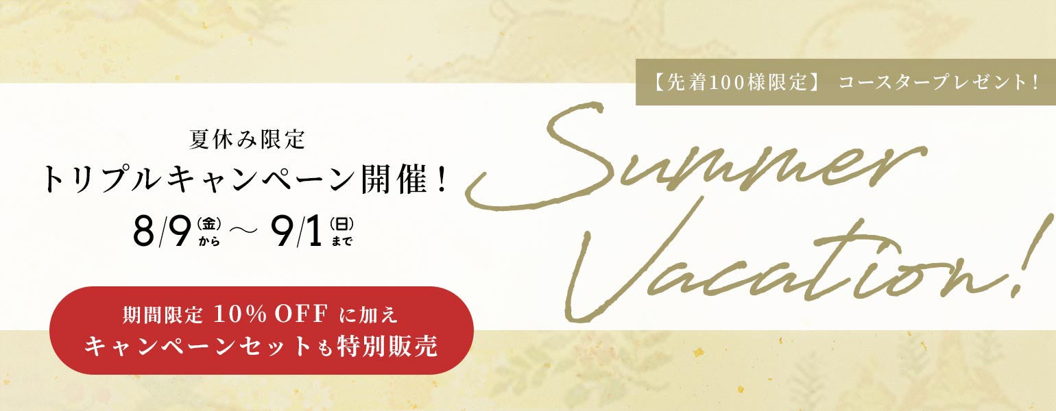 株式会社龍村美術織物(本社:京都府京都市右京区、代表取締役:龍村育)は、2024年8月9日(金)~9月1日(日)の期間、『トリプルキャンペーン』を、公式オンラインショップで開催致します。この夏のお買物をもっとおトクに、よりお楽しみ頂ける3大特典をご用意致しました。
