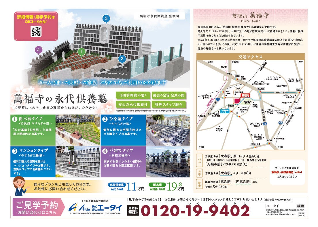 全国に永代供養墓・樹木葬を展開する株式会社エータイ(本社:東京都千代田区、代表取締役:樺山玄基、以下「当社」)は、東京都大田区「慈眼山 萬福寺」(以下「萬福寺」)に永代供養墓・樹木葬を新設し、2024年10月24日(木)より販売受付を開始します。