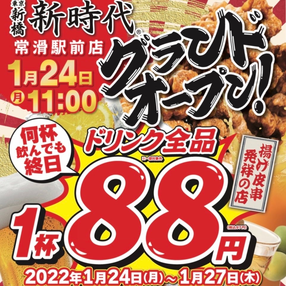 「新時代 常滑駅前店」のオープンを記念し、ドリンク全品を1杯88円(税込97円)でお楽しみいただけるキャンペーンを開催します。一度、『新時代』にご来店頂ければ、新時代がなぜこんなにも人気なのかを分かって頂けると思います。皆様のご来店お待ち申し上げます。