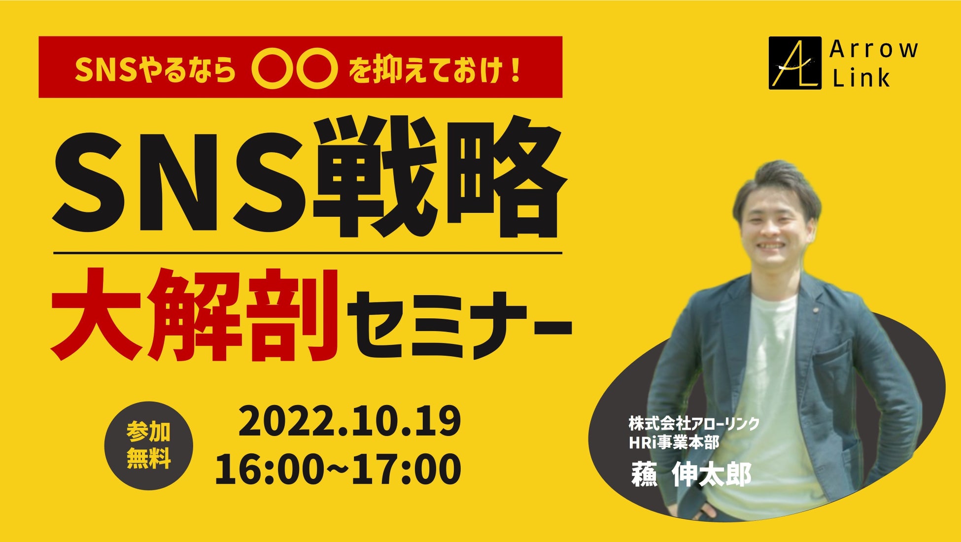 株式会社アローリンク(本社:兵庫県神戸市、代表取締役:蓬莱和真)は、10/19(水)にSNS採用実施企業様向けのオンラインセミナーを無料で開催します。「SNSやるなら〇〇を抑えておけ!SNS戦略大解剖セミナー開催決定!」と題し、コロナ禍に最適な"SNSを活用した採用戦略"について詳しくお伝えします。