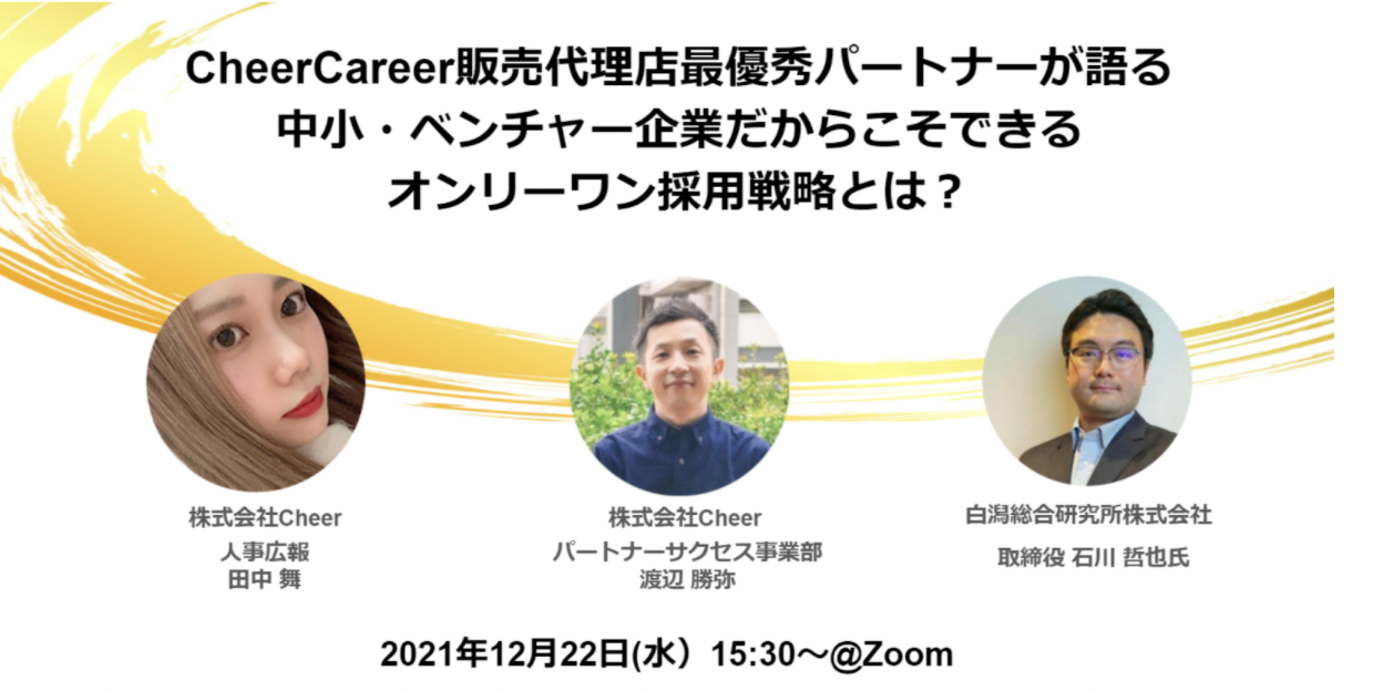 またこの度のセミナーは、入社後の組織への定着設計、組織課題にフィットしたオンリーワンな採用計画を立案していく事に強みを持つ白潟総合研究所株式会社様、中小・ベンチャー企業への入社意欲が非常に高い学生の利用が多いCheerCareerを運営している株式会社Cheerが共同で開催いたします。