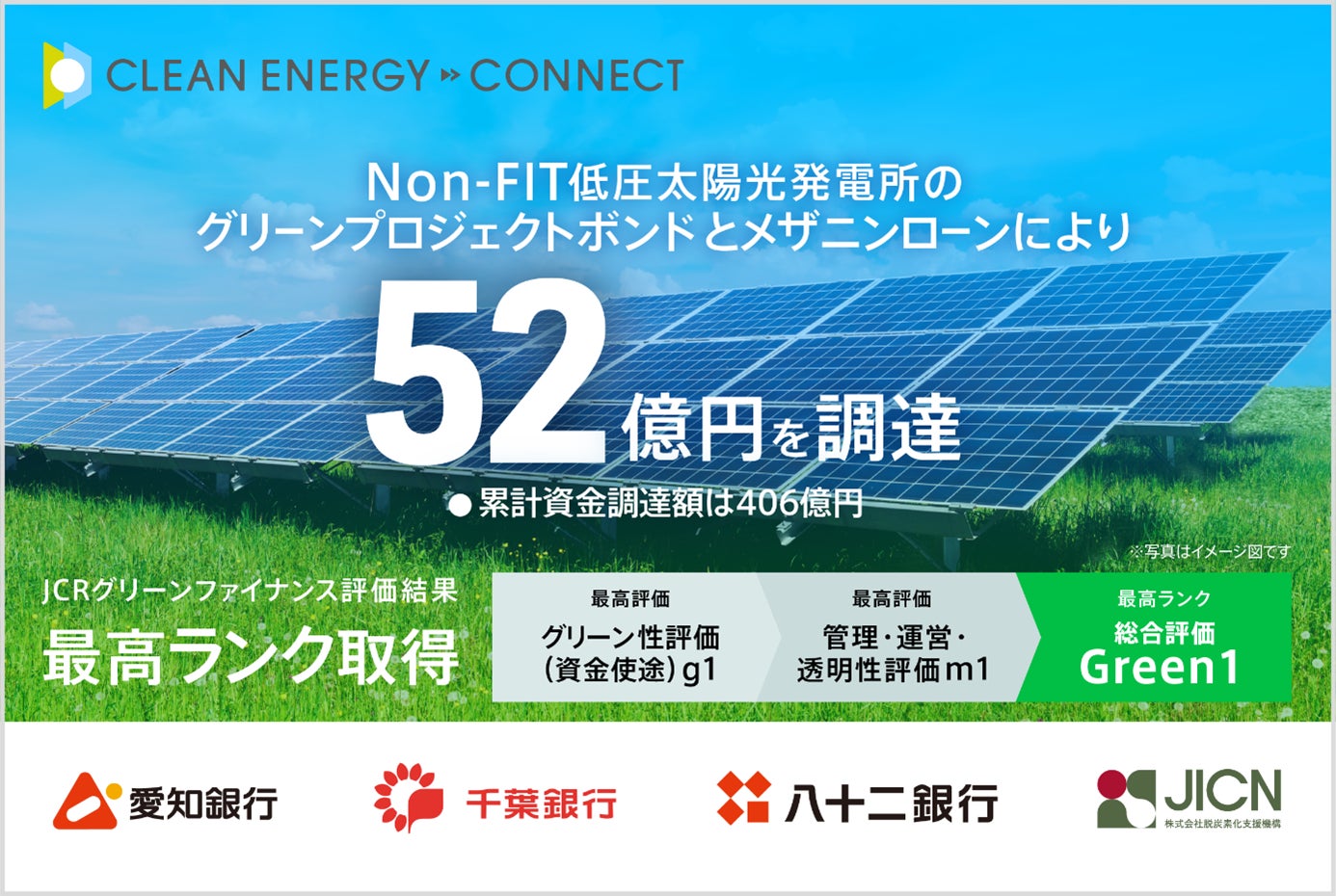 脱炭素ソリューションを手がけるクリーンエナジーコネクトが、Non-FIT低圧太陽光発電所のグリーンプロジェクトボンドとメザニンローンにより52億円を調達、累計資金調達額は406億円に