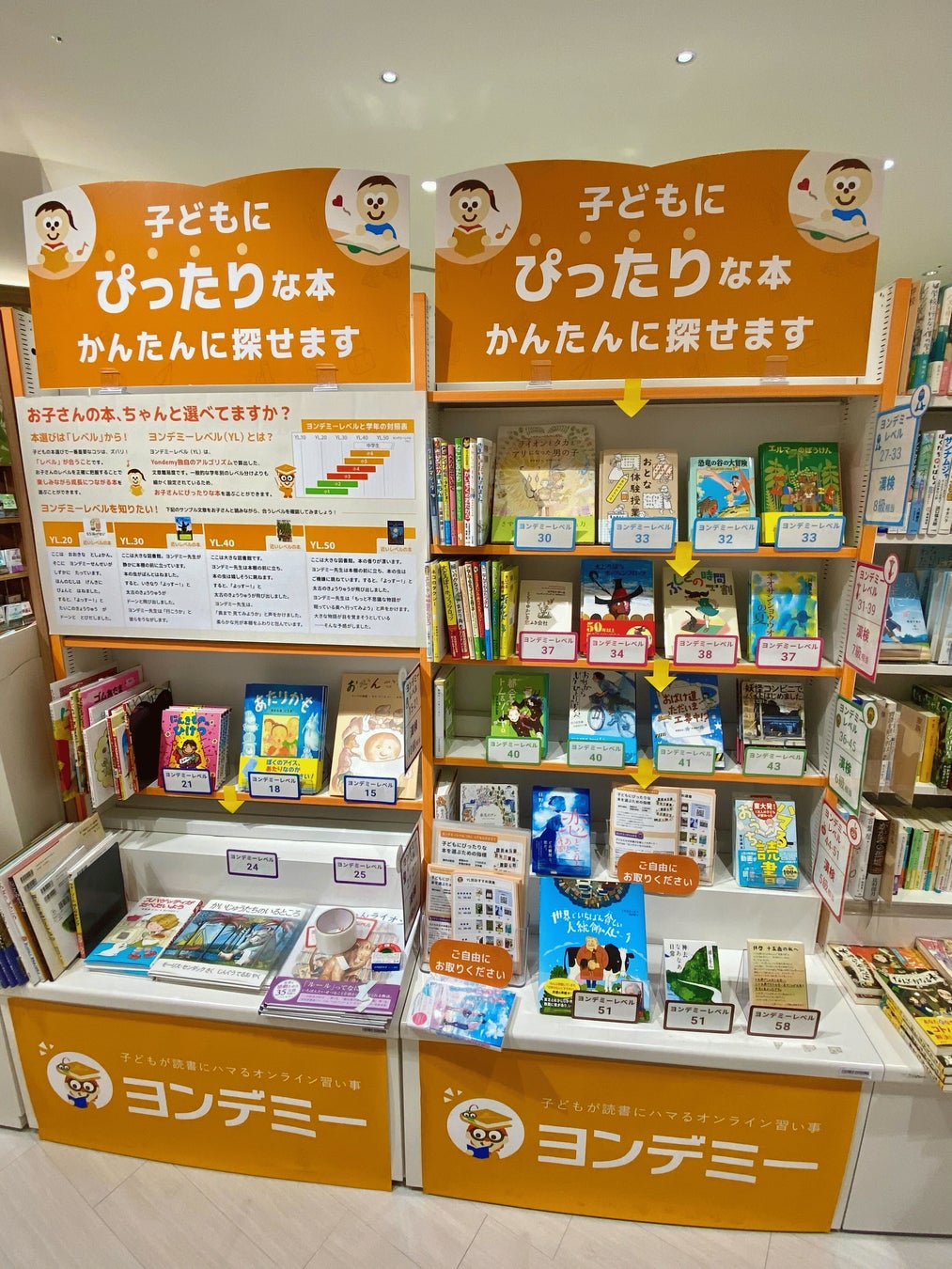 昨年、書店業界の新たな収益源の創出と地域コミュニティの活性化を目指し、未来屋書店との連携を開始(※1)しました。現在、全国の未来屋書店において導入を順次拡大しています。2025年1月からは、未来屋書店川口店にて、子ども向けの本をレベル別に選びやすい「ヨンデミーレベル(YL)」本棚コーナーを設置しています。「どの本を選べばいいかわからない」と悩む保護者や、読みたい本を探している子どもたちが、自分にぴったりの一冊と出会えるようサポートします。読書の楽しさを広げ、子どもたちの成長を支える、新しい読書体験をお届けしています。